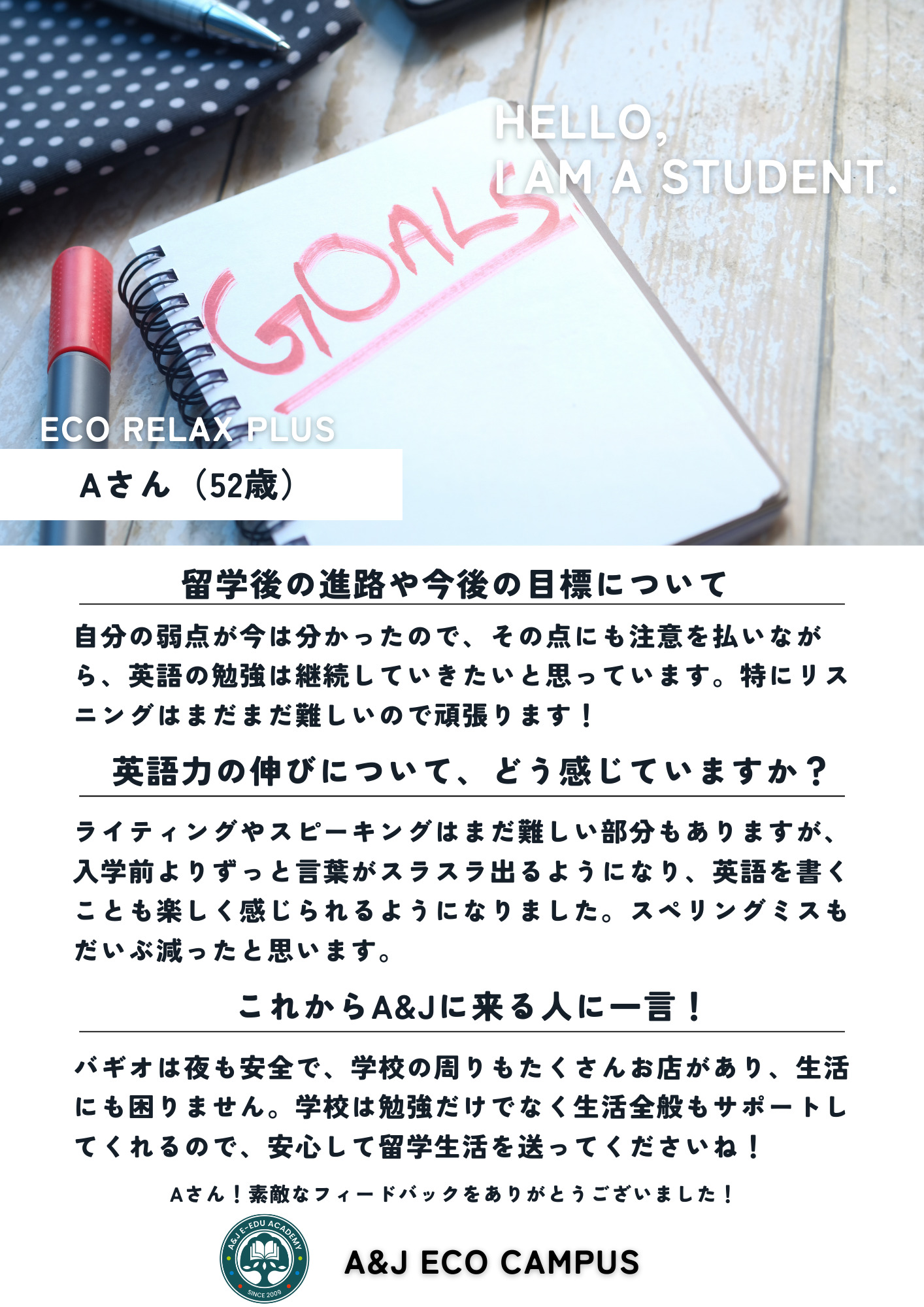 ESL(ECO RELAX PLUSコース)卒業生のリアルな声をお届け! 2025年11月28日号 エコキャンパスニュースレター 2025年12月2日 A&Jライフ ECO CAMPUS お知らせ ニュース ニュースレター バギオ 未分類 海外生活 生徒レビュー 留学 留学体験談 英語学習 2カ国留学 A&J インタビュー バギオ留学 フィリピン フィリピン留学 ワーホリ 体験談 週末の過ごし方